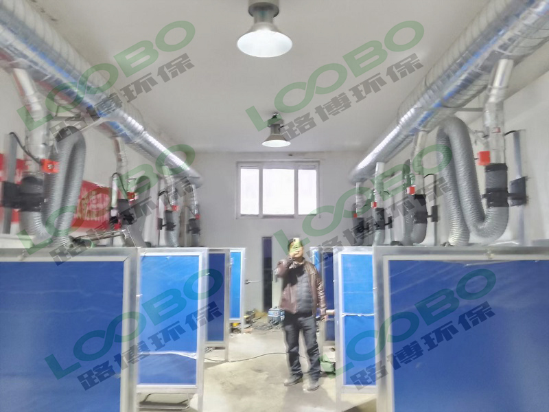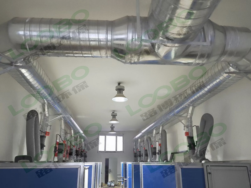 該項目為多工位焊接煙塵治理,采用工藝為中央煙塵凈化系統,主要除塵設備為LB-PC多濾筒除塵器,將多個工位設置柔性吸氣臂收集煙氣后集中通過管道進入濾筒凈化器內部進行凈化,室外排放出潔凈的氣體。近年來做過很多學校的焊接除塵項目,總結經驗為更多的學校提供更好的服務,解決大氣污染的問題,保障了學生的健康。