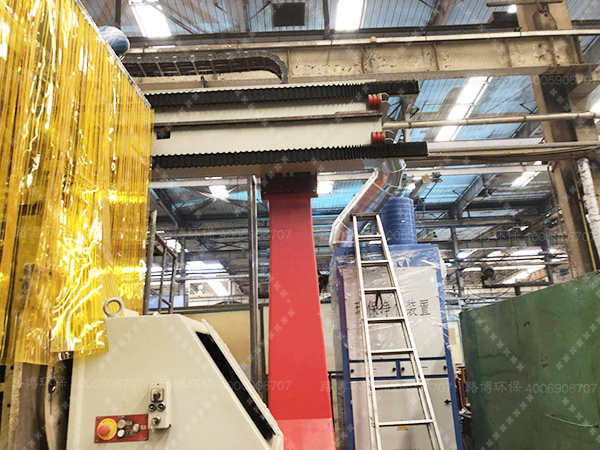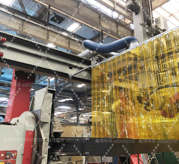 本項目用于山推焊接車間內焊接機器人工位焊接煙塵治理,機器人工位工件尺寸較大,活動范圍6M*5M,機器人在焊接過程中產生大量的煙塵。根據工況,路博環保采用移動式頂吸罩對工位焊接煙塵進行捕捉,在整個使用過程中不干涉機器人的動作及工位的吊裝,每個工位配置一套除塵系統,濾筒除塵器型號選用LB-CY-8.