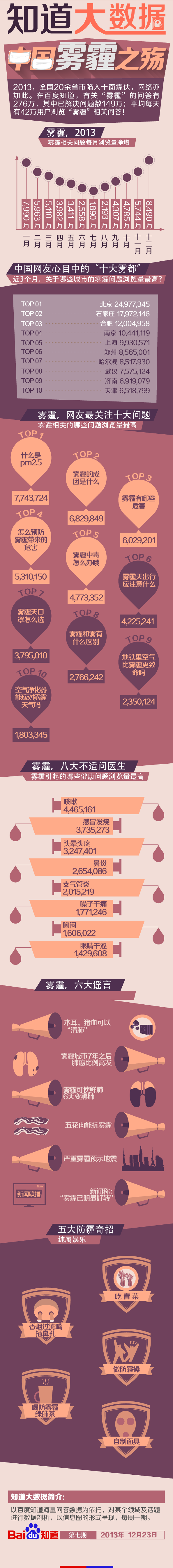 2013,全國20余省市陷入十面霾伏,“霧霾”成為全民話題!在百度知道,有關“霧霾”的問答有276萬,平均每天有42萬用戶瀏覽“霧霾”相關問答!知道大數據,盤點中國網友心目中的“十大霧都”,粉碎霧霾六大流言!對了,你今天吃青菜了嗎?