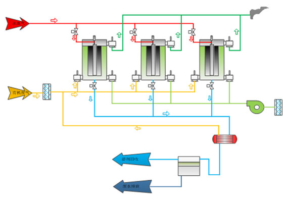 ??????? 雙氧水是具有工業應用價值的無機化工產品,在造紙、化工、食品、環保等領域應用廣泛。在蒽醌法雙氧水生產中,蒽醌首先在加氫催化劑的存在下,發生加氫反應生成氫化蒽醌,然后氫化蒽醌被氧化再轉化成蒽醌的同時生成雙氧水。生成雙氧水經萃取、提純、濃縮即可成品;工作液則經過再生、除水和凈化后循環使用。但是在生成產品的同時氧化塔水冷后的尾氣往往含有一定濃度的重芳烴廢氣,所以需要對排放的廢氣進行處理,處理后的廢氣可以達標排放,同時回收的溶劑可以循環再利用。目前普遍的處理方式為“吸附+脫附+冷凝回收”工藝。