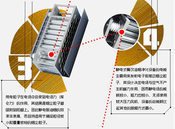 ?? 1、?油煙凈化器的電場使用圓筒蜂窩式結構,使靜電場能均勻地達到很大的平均電場強度,極大的增加了電場凈化面積,使電場與油煙粒子結合作用的時間更長,從而決定了設備具有極高的除油煙效率。?