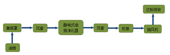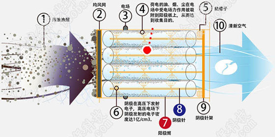?????? 煙氣在抽風裝置風機的作用下,經過本設備的多級靜電場的捕捉分離,成為較干凈的氣體再排出,達到煙氣凈化的目的。在靜電場中分離出來的液滴、煙塵被沉積在電場組件的各個陽極筒內壁上,然后匯流到集油槽排出作統一的回收處理。????????????????????????????????????????????