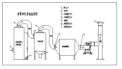 噴漆廢氣產生于工件涂裝的噴漆工作臺,高壓空氣噴射出的油漆大部分留在工件上,其它的隨著廢氣帶出,形成漆霧粉塵。這些粉塵含量不高,粒徑較小,絕大部分在10μm以下,塔體外部的漆霧在風機的吸力下進入本無填料噴霧式漆霧凈化塔,氣體經塔體內的氣體分布器分布后向塔內上方行走,在行走的過程中,遇到多級噴淋洗滌的凈化液,漆霧與液體進行完全飽和接觸,顆粒狀塵霧被水帶走進入貯液槽,并由水泵抽走,余下的干凈尾氣通過網狀過濾器過濾后,再進入下一組多級噴淋洗滌工序,經再次多級噴淋洗滌處理,和網狀超細過濾器過濾后余下的空氣排出。